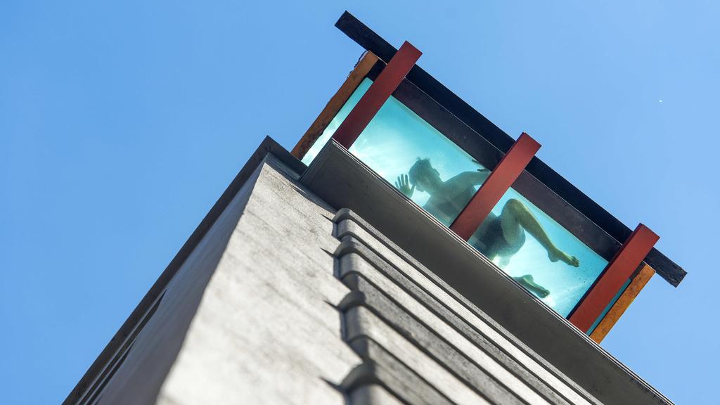 The rooftop swimming pool is cantilevered 1m over the hotel’s facade. Swimmer Ryan Beal peers through the pool’s glass bottom, onto Flinders Lane. Picture: Eugene Hyland