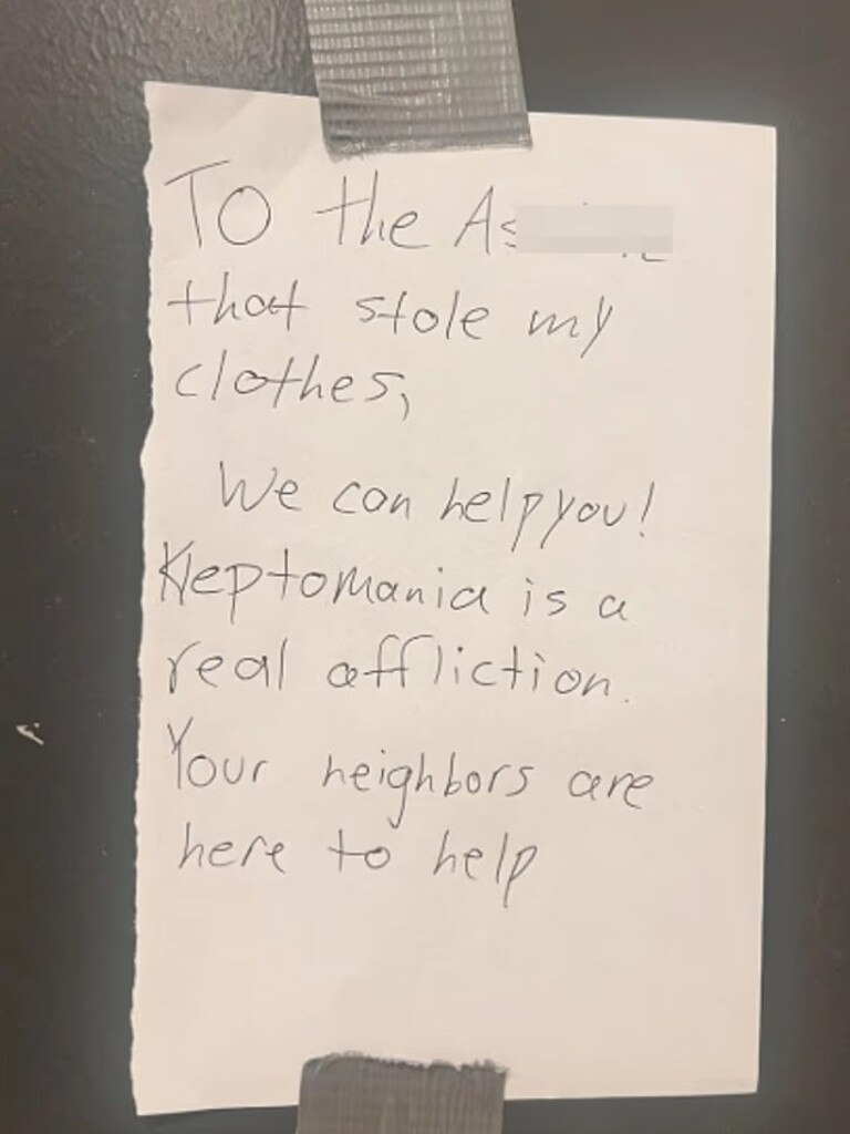 ”To the a**hole that stole my clothes, we can help you! Kleptomania is a real affliction. Your neighbours are here to help,” a note, stuck to a wall with duct tape, read.