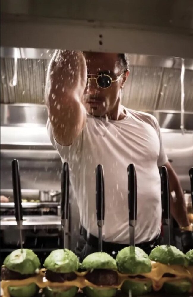 The clip shows him slicing a boned steak then performing his trademark move – with his hand shaped “like a cobra” and rock salt bouncing off his arm onto the meat.