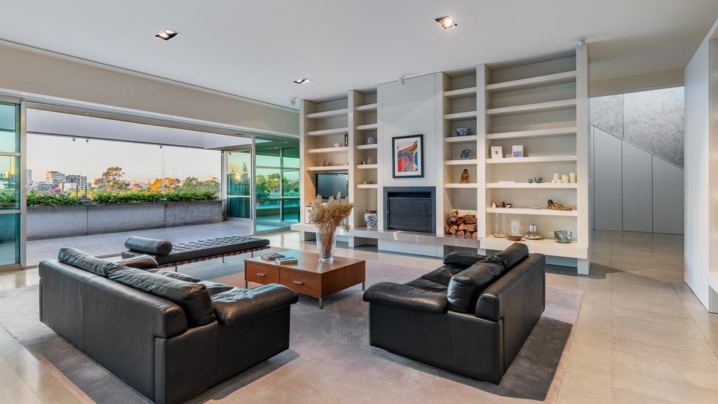The three-bedroom apartment includes ensuites for each room, a rooftop cinema room, natural stone bathrooms and sweeping views of the city skyline.