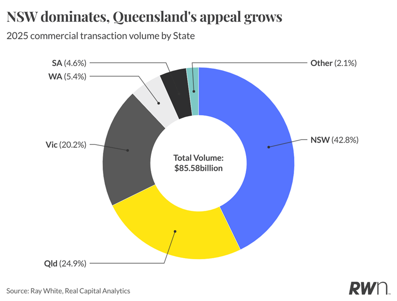 Queensland accounted for a quarter of all transaction volume, up 61.1% on 2024 to $21.35 billion.